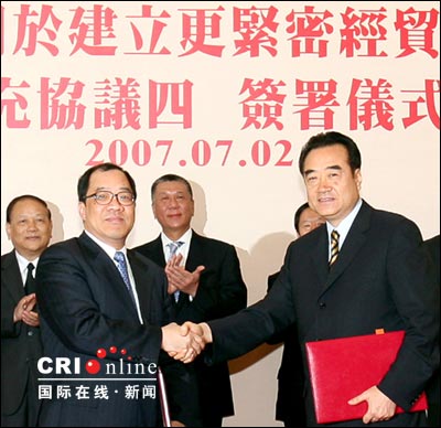 国际在线专稿(驻澳门记者 丁波):《内地与澳门关于建立更紧密经贸关系的安排》(CEPA)补充协议四,7月2日在澳门正式签署,根据这一协议,从2008年起,内地廿八个服务贸易领域对澳门进一步开放。澳门特区行政长官何厚铧等出席了签字仪式。