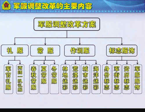●服装样式:大檐帽调整了翘度,军官增加了帽檐花;陆、空军和海军白色春秋常服采用了猎装式;在常服结构上,男装采用“T”字造型,女装采用“X”造型;夏季通用作训服由夹克式改为散摆式,袖口可上卷,更符合作战训练需要……