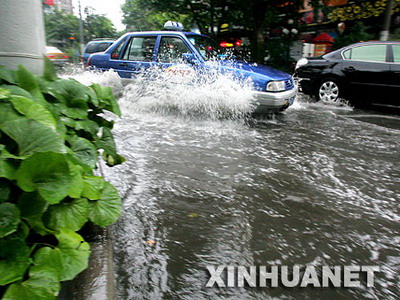 6月28日,一辆出租车在积水达15厘米左右的衡山路上行驶。