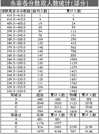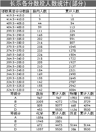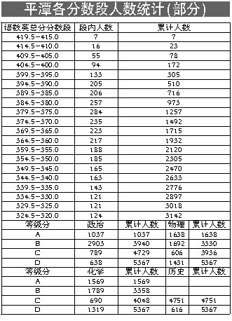 专家表示,考生可以根据自己的排名,预估能上什么学校。比如,某中学计划招500人,而上了400分的考生仅350人,这就是说,如果一个考生考了400分,在其他各科都达到了等级要求的情况下,他就有希望上这所中学。