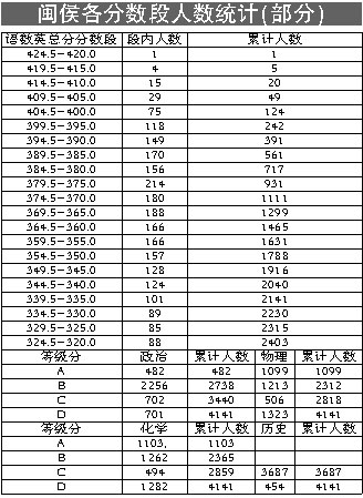 昨天,福州市中招办公布了今年中考成绩各分数段人数统计(部分详见表格)。专家说,考生根据自己的排名,再对对各学校的招生计划,就可以估出自己大概能被什么样的学校录取。