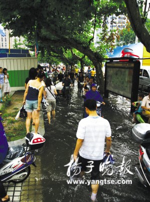 另据了解,昨天南京市排水管理处也与强暴雨打起“排水战”,由于近两年来,内秦淮河、内金川河连通外秦淮河的所有泵站,全部修缮得以改造,多个泵站的排水流量扩大了1倍,外秦淮河泄洪量达到300立方米/秒。象房新村、三条巷、太平南路等100多个淹水片得以改造,小口径、陈旧的下水管改成大口径的新管道。加上去年起100多条背街小巷的整治工程启动,以前容易形成淹水片、小街巷,通过下水管到城市河道、大口径箱涵(支管),再到泵站,再排入外秦淮河,直至汇入长江,南京市整条排水体系已全面“扩容”,昨天出现暴雨后,城区防汛办还立即启动应急预案,根据天气预报及雨情,随时安排泵站启动排洪。