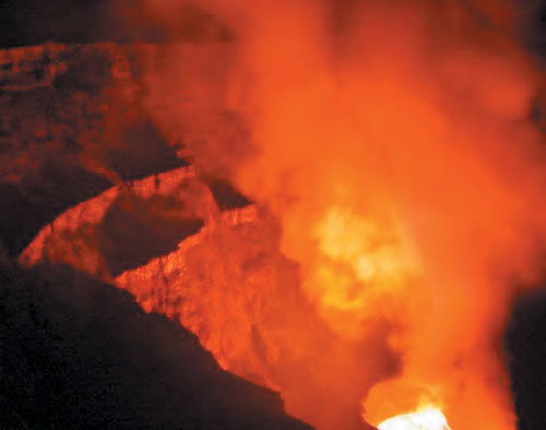 每到晚上,火山岩浆湖的火光能够照亮火山岩壁。