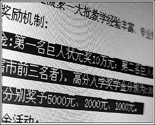 比如北京一家高考复读学校,就在网上打出了这样的广告:第一名奖10万元,第二名奖8万元,第三名奖5万元。在上海,也有许多学校在招生简章中承诺参加复读的考生来年若考进北大、清华、复旦、交大等名校,可获奖励5000元~10000元;除了北京、上海这样的大城市,其他一些中小城市为了争夺生源,其竞争更是激烈。