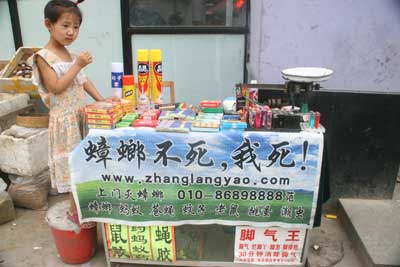 记者在现场看到,摊主摆出一张桌子,上面摆有四种灭蟑药,“蟑螂不死,我死”的条幅十分醒目。摊主指着10元一包的灭蟑药称,他卖了好几年,这种最好用,有很多回头客。“你放心吧,今晚撒上,明天就见效,蟑螂接触就死亡。”他称打出这样的广告,就是想宣传这个灭蟑药确实管用。