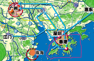 快速连通“大珠三角”规划中的五大城际线首先是穗莞深城际线,其起点站在深圳市福田中心区,终点站在广州,这是联系深圳核心区与前海-宝安、福永、沙井、东莞长安-虎门、莞城、广州等地的重要线路。深圳地铁11号线将在松岗预留向西北延伸与东莞段线路衔接的条件,条件成熟时利用11号线轨道直通深圳市政治、文化、经济中心区——福田中心区。其次是深莞城际线,起点站在龙华火车站(即位于深圳宝安龙华的深圳新客站),终点站在东莞。这是联系深圳中西部龙华、光明与东莞松山湖、莞城等地的线路。由深圳地铁6号线在光明预留向北延伸与东莞市域轨道快线R1线衔接条件,条件成熟时利用6号线轨道直通龙华新客站。其三是深江城际线,起点在深圳市福田中心区,终点在江门。这是联系深圳核心区、龙华、福永、中山、江门等地“西行”的重要线路。由于跨江工程浩大,该线路将考虑与厦深铁路西延段合建,并利用广深港客运专线龙华以南段富余能力建设。其四是西部深港城际线,起点在深圳西部的前海湾,终点在香港。这是联系深圳西部滨海地区与香港中心区及香港机场等地,也是联系粤港的又一重要线路。由深圳地铁11号线在前海预留向南延伸至香港的条件。其五是深惠城际线,起点在深圳市福田中心区,终点在惠州。这是联系深圳核心区、东部城区与惠阳、惠州等地“东行”的重要线路。由深圳地铁14号线在坑梓预留向东延伸与惠州市轨道线路衔接的条件,条件成熟时利用14号线轨道直通福田中心区。