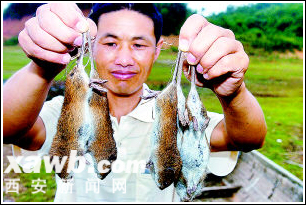 据悉,岳阳市岳阳县鹿角镇已经出台土政策,规定打死一只东方田鼠可以得到1角钱的奖励。很多村民是全家上阵打老鼠,有村民3天便上交老鼠尾巴2700条。但是,由于老鼠太多,这种土政策效果不大,该镇约2万亩农田仍然在老鼠的威胁之下。有人做了这样一个推算,假如一只老鼠一天吃4克粮食,20亿只老鼠一天就可以吃掉粮食80万公斤。《长沙晚报》供稿