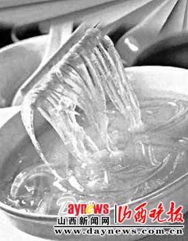 老板也承认这是假鱼翅,但“假鱼翅虽说是拿鱼胶、明胶做的,但厂家加了添加剂,怎么煮都不会断。”