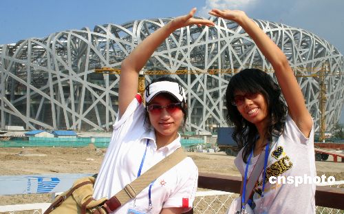 七月十日,参加“二○○七台湾青年千人夏令营”的台湾青年高佳音和林宛蓉参观了二○○八北京奥运主体育馆“鸟巢”,并为它搭建了一个特殊的“人体拱门”。中新社发 刘颖 摄