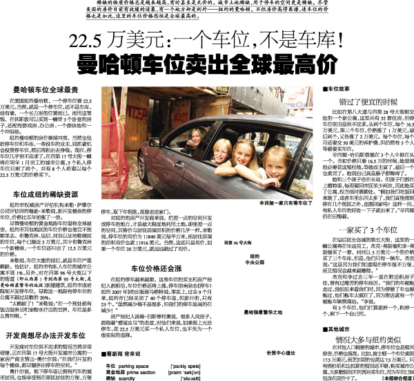 稀缺的物质价格总是越来越高,有时甚至是无价的。城市土地稀缺,用于停车的空间更是稀缺。尽管美国的房价目前有放缓的迹象,有一个地方却是例外——纽约的曼哈顿。不但房价高得离谱,连车位的价格也是如此,这里的车位价格恐怕是全球最高的。