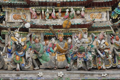 到过漳州东山关帝庙的人,一定对屋脊上做工精细的人物造型惊讶不已。东山关帝庙仅太子殿屋脊上就有120个英雄人物,如“八仙过海”、“封神演义”、“李世民登基”、“岳母刺字”、“穆桂英挂帅”等造型,堪称剪瓷雕的代表作。
