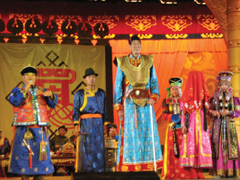 祭祀玛尼宏神台仪式拉开了喜顺结婚的序幕。身着孔雀蓝缎蒙古袍,脚蹬牛皮长靴的新郎喜顺和亲朋好友来到玛尼宏神台前,婚礼祝颂人用蒙古语宣布祭祀仪式开始,三声海螺号吹响之后,大家共同跪拜了玛尼宏神台。