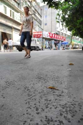 居民张先生说,就是这些黏糊糊的液体滴到地上,使路过的行人“中招”,而且地面上全是“油印”,好长时间也不会干。