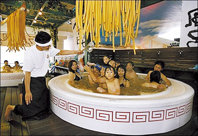 一家拉面馆店主说:“洗‘拉面浴’时,人们既能得到乐趣,又能利用到面条中健康成分。”