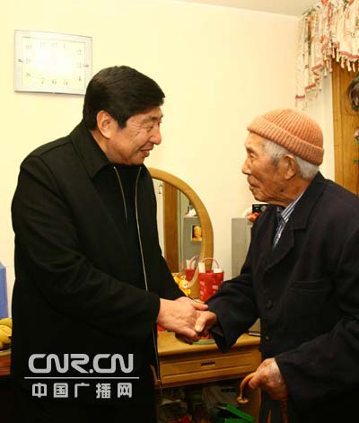 青岛港的又好又快发展,离退休的老同志们一同享受到改革发展的成果,图为青岛港董事局主席、总裁常德传看望百岁老人席思海时照片