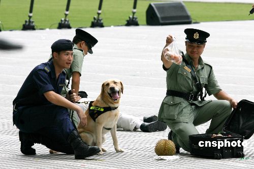 图:香港海关缉毒犬稽查示范表演 中国新闻网 中国新闻网官方账号 2007.07.1521:39 关注 七月十五日烈日当头﹐香港特区纪律部队在大球场举行联合大会操﹐庆祝香港回归十周年。图中海关一只精良缉毒犬在模拟入境处现场﹐查获旅客行李箱有违规物品后﹐又追查到“行李主人”。中新社发 王丽南 摄