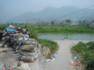 在金先生房子的后面,流淌着那条长达十几公里的菇溪,沿岸堆着不少工业垃圾和居民的生活垃圾,对面岸边不远处一堆垃圾正在露天焚烧,黑烟滚滚直冲云霄,空气中飘浮着一股刺鼻的气味。