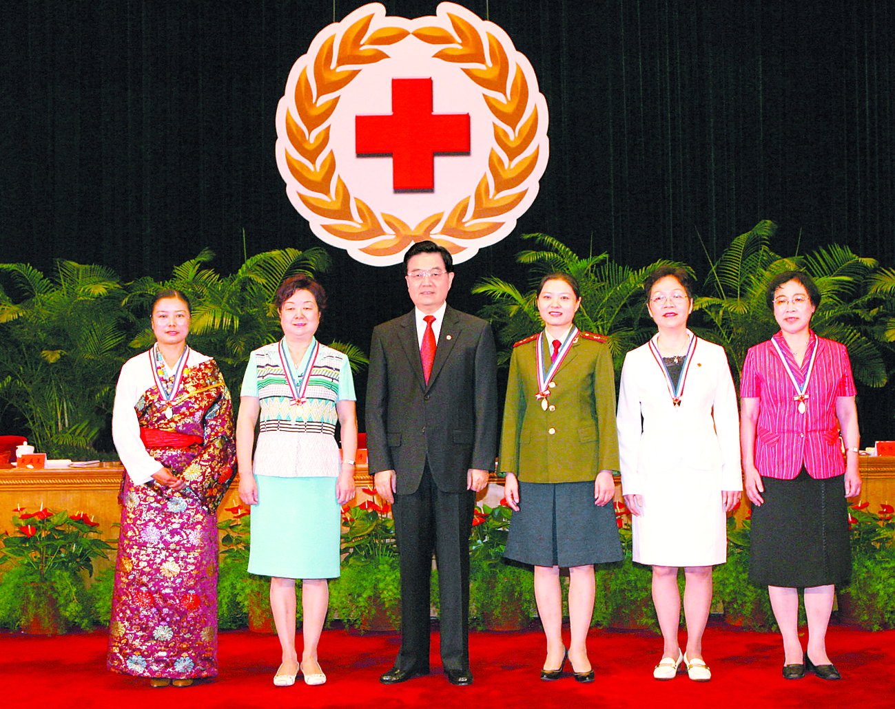 7月17日,中共中央总书记、国家主席、中央军委主席、中国红十字会名誉会长胡锦涛为第41届南丁格尔奖章5位中国获奖者颁奖。新华社记者李学仁摄