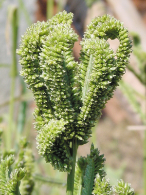 龙爪稷的秆高1米左右,叶片、种子和小米差不多,但种子的体积稍大点,直径在1—1.8毫米,圆球形,深棕色,摸上去很滑,收成后可做饼、面包、煮粥,也可酿啤酒。