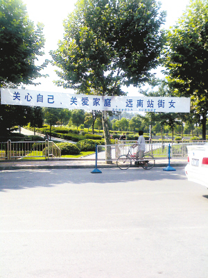 近日,南京栖霞区尧化门街道和当地派出所在尧化门广场公园挂起横幅,劝诫市民远离站街女。据周围居民反映,此举效果非常好,夜晚站街女不敢来了,想和站街女搭讪并寻求刺激的男人也都不见了。据居民介绍,每年的5月至10月,尧化门广场公园内站街女非常多。据《南京晨报》