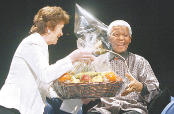 7月18日,南非约翰内斯堡,南非前总统曼德拉正从爱尔兰前总统罗宾逊夫人手中接过一篮水果。图/IC