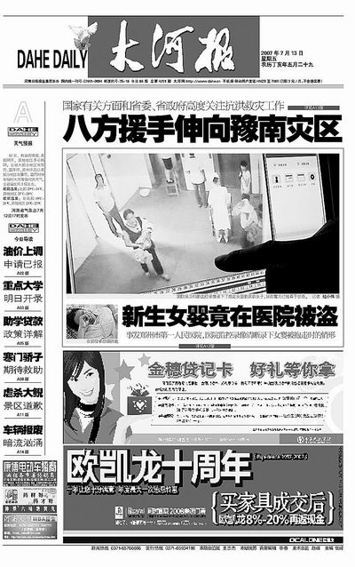 案破后,女婴父亲孟二虎激动地拉着记者的手,再三对本报和读者表示感谢。右图为7月13日本报头版独家报道,本报已连续做了7篇跟踪报道。