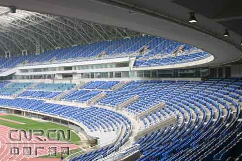 小于:对,我现在和天津市体育局副局长、天津奥体中心筹备黄东升先生一起走进了"水滴"里面巨大的赛场。里面真大呀,南北看台各竖着一块巨大的液晶屏幕,比一个排球场面积还要大,国内名列第一。 看台上6万把蓝色的座椅非常漂亮整齐,壮观得像海浪一样环绕全场。哎,黄局,你看,除了场地中心,屋顶基本把球场都盖住了。