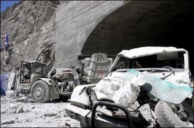 7月23日,记者从青海省安监局了解到,7月20日1时许,拉西瓦水电站工地左岸高边坡发生山体滑坡事故,800多立方米土石滑落。其中不少土石下坠300多米后落入正在浇灌混凝土的电站大坝17号坝段,造成7名施工人员当场死亡,另有1名在左岸卸料平台工作的人员被石块砸成重伤,经抢救无效死亡。图为混凝土浇筑平台上的指挥车辆和运输车被砸毁(7月22日摄)。据新华社记者任晓刚摄