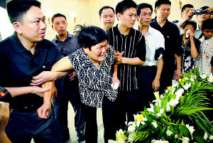 杨九勤第一个走近爱人的遗体,事发当天,这个熟悉的身体就是靠在她的怀中去世的。在追悼会开始前,杨九勤告诉记者,她的眼泪“都快哭干了”,但当见到曾经深爱的人静静躺在棺木中,彼此已是阴阳两隔,她的眼泪再一次涌了出来,越哭越伤心,最后竟哭倒在地。身边两名家属用了近两分钟,才把杨九勤扶起来。