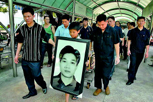 上午10时14分,最终临别时刻到了,早已泪湿眼眶的母亲黄长桂和未婚妻杨九勤在亲友的搀扶下,最先走近安放王祚炳遗体的棺木前,向遗体告别。看着儿子、爱人的遗体,黄妈妈和杨九勤早已泣不成声,几次想俯下身子再去摸摸王祚炳,但几次伸出手后又都不由自主地缩了回来,捂着脸部哭成一团。