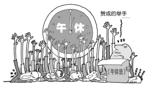 媒体报道说,每天下午2时到下午4时30分,是西班牙人的午休时间。当然,西班牙人的下班时间也相应推迟了。据说,这个奇怪的传统还要追溯到上个世纪早期。那时,很多人迫于生计不得不同时干两份工作,上午一份,晚上一份,这中间就需要较长一段时间回家好好休整一下。但在今天看来,这个午休时间似乎真的是太长了。西班牙政府日前颁布了新规定,要求所有政府机构实行45分钟午休制度,即每天中午12时30分开始休息45分钟,这样员工们可以在下午6时下班。