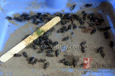 这些无名的黑漆漆的虫子,比苍蝇大、比蝗虫小,会爬、会飞,在战斗了七八个小时后,近百名茶城的管理者及商户们已疲惫不堪,小黑虫却层出不穷,越战越勇,灭了一批又来一批,它们踩着同伴们的尸体源源不断地向商铺里“进攻”,这一场人虫大战,看来在今天还将继续……