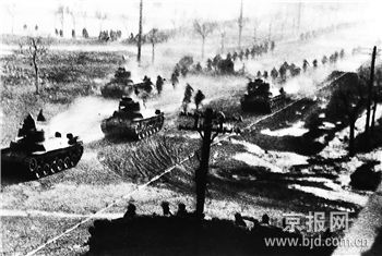 图为人民解放军以坦克为前导进入沈阳市。 新华社发