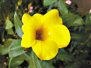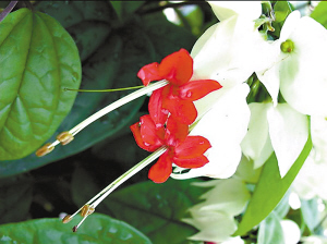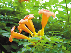 凌霄 形态特征:为紫葳科凌霄花属藤本植物,有气生根,小枝紫红色。羽状复叶对生,小叶卵状长圆形,先端尖。圆锥花序顶生,花漏斗形,橘红色。花期为6月份至9月份;蒴果长圆形,果熟期9月份至10月份。原产北美,性喜温暖、湿润、向阳环境,适生温度15℃至25℃,宜于疏松的沙壤土生长。播种、扦插繁殖。该植物花色艳丽,花期长,通常多用作垂直绿化,亦可用于林下地被。软枝黄蝉 夹竹桃科,常绿蔓性藤本植物;叶3~4片轮生,倒卵状披针形或椭圆形,先端渐尖。用于庭园美化等,花色为黄色,花期为5月~12月,盛花期为夏季。全日照,性喜阳光充足。龙吐珠 原产非洲西部,马鞭草科,多年生常绿藤本植物。株高2~5米,聚伞形花序腋生;春夏开,花萼白色,花冠上部深红色,花开时红色的花冠从白色的萼片中伸出,宛如龙吐珠。美丽桢桐 又名臭牡丹、香盏花、百日红、红苞花、状元红,马鞭草科,红色嫩枝稍有柔毛,枝内白色中髓坚实。聚伞花序紧密,花冠淡红色或红色、紫色,有臭味。核果倒卵形或卵形,成熟后蓝紫色。天冬 百合科,攀援状多年生草本植物。花黄白色或白色。浆果球形,熟时红色。花期为5月份。分布于我国中部、西北、长江流域及南方各地。簕杜鹃 别名宝巾,九重葛,紫茉莉科,硕大,木质藤本植物,花美丽,通常散生于长而具叶的枝条上,红色或紫色,花期较长,为冬春间。原产巴西。希美利 茜草科,又名小爆仗花,醉娇花,常绿灌木至小乔木。枝条细长分枝多,绿色至暗红色。花红色至橙红色,花冠未绽开时呈长筒状。原产于巴拉圭等拉丁美洲诸国。马缨丹 马鞭草科。又叫五色梅、臭草。叶具臭味,花色变化大。有黄、橙黄、红、粉红等色。5~9月开花。原产热带美洲。龙船花 缅甸的国花,又名山丹,为茜草科常绿小灌木,花期为夏、秋季,常开不败,花瓣细小,但数量众多,成簇成群地聚生于枝条之上,且颜色鲜红,似一团团熊熊燃烧的火焰。虽然植株矮小,但花和叶都很漂亮,特别适宜庭园栽植观赏,也可用于灌丛、林下或道路边缘布置,因为花期较长而被人们称为“百日红”。金银花 又名银花、双花、忍冬花、鹭鸶花、二宝花。多年生半常绿缠绕性木质藤本植物,花蕾和初开的花为黄色。味甘性寒,并且有清热解毒、疏散风热的功能。黄素馨 木樨科、常绿、藤状灌木,高可达3米;叶对生,3小叶,小叶纸质,矩圆状披针形,花单生,黄色。常常重瓣,3~4月开花。原产我国西南部。吉祥草 浆果红色,变种有银边吉祥草,叶缘白色或有白色条纹。为中国长期栽植的花卉。以观叶为主要目的。鸭趾草 又名紫鸭趾草,是鸭趾草科水竹草科多年生常绿草本。原产美洲的热带地区。性喜温暖湿润及半阴的环境。本报讯 (记者刘幸 通讯员左宜弘)广州又称花城,但主要干道上不少人行天桥、立交桥光秃秃的形象让广州减色不少,不少市民纳闷:广州众多的人行天桥、立交桥为啥不用多点花花草草来点缀呢?昨日,记者从有关部门了解到,广州市首次对人行天桥、立交桥绿化的种植及养护管理的技术规范出台推荐性地方标准——《人行天桥、立交桥绿化种植养护技术规范》,为人行天桥、立交桥引种的花色分别为紫红、粉红、白色、黄红、黄色、紫色的13种植物,给广州众多的人行天桥、立交桥增姿添彩。