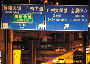 有些同一条路上的交通指示牌,一块是标注英文的,另一块却是标注拼音的。黄埔大道上往琶洲方向指示“广州大学城”一直用英文“GUANGZHOU HIGH EDUCATION MEGA CENTER”,但一上琶洲桥后,就全变成了拼音“GUANGZHOU DAXUE CHENG”。
