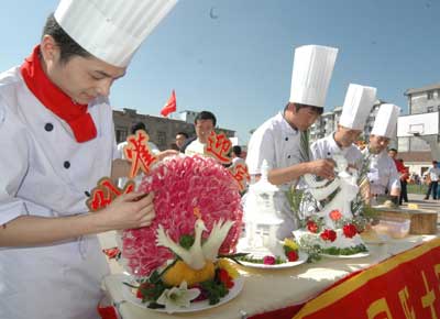 “大厨”大比拼 北京娱乐信报 2007.07.3101:20 关注 7月30日,参赛选手在雕刻比赛中。 当日,黑龙江牡丹江西安区举行餐饮行业岗位技能大比武,共有23家餐饮业的1000多名服务人员参加了雕刻、托盘跑等比赛。 新华社发