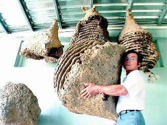 据台湾《联合报》报道,简铭锋从十八岁就开始捕蜂至今五十岁,与虎头蜂交手近千回,每次总能满载而归。他家里墙上里里外外挂满大小不一的虎头蜂窝巢,相当壮观。他说:“太大或太小的蜂巢都留在山区,没带回家的至少有三四百个。”