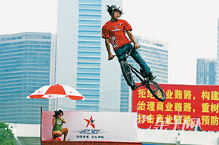 昨天上午,在天河体育中心南广场2007CX极限赛广州站决赛的现场,烈日当空,但观众的掌声不断。来自港澳台和内地的极限单车选手联手为观众演绎最高水准的精彩对决。好奇的市民近距离目睹了空中放开双手的“NOHANDS”绝技、空翻和360度带车转体等高难动作,不禁啧啧感叹!