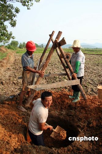 图为8月1日,江西东乡何坊村村民组成抗旱用水互助组,一起在自家田里抢挖抗旱井。据悉,由于持续高温和干旱无雨,江西东乡出现50年不遇的旱情。7月底,该县按照自愿互利的原则组织群众成立抗旱用水互助组,采用共同投资同劳的方式抢挖抗旱机井。截至8月1日,抗旱互助组已抢挖抗旱井100多口,受益农田面积达3000多亩。中新社发 何江华 摄