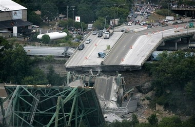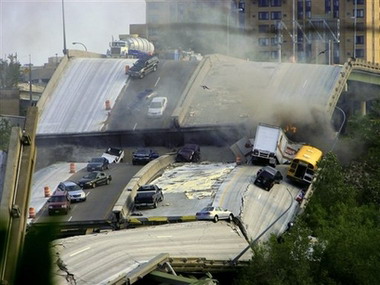 从航拍的图片显示,大桥的中间陷了下去,形成了一个大洞,很多汽车横七竖八的散落在塌陷的桥面和水中。一个目击者称,事故发生时,在桥面上行使的汽车像“玩具车”一样滑落到水中。(关新)