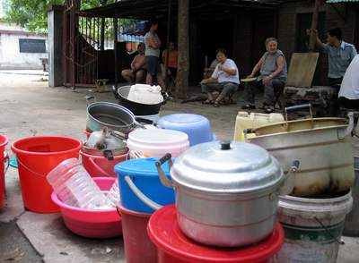半小时后,一辆送水车出现在楼前,早已守候多时的居民拿着接水工具从各单元内飞奔而出,许多老人和孩子也加入了“抢”水队伍。居民们的接水工具不仅用上了锅碗瓢盆,矿泉水瓶、饮料罐也都派上了用场。“这也是被逼无奈下想出来的办法,”一位居民告诉记者,即使用上了所用能盛水的用具,水还是不够用。这位居民说,现在家里不敢糟蹋一滴水,一家人洗脸用一盆水,洗完脸后还要留着冲厕所用,尽管如此,还是连澡都洗不了。