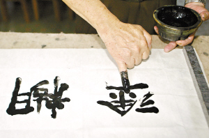 “我现在能写8种字体。”梁伯说,像正楷、隶书、草书等8种字体他都能写。“细长的笔画用指甲写,一般大小的线条用小指指侧写,像隶书这种粗大的字体就要用指腹来写。”不同的字体,写法自然不同。梁伯告诉记者,由于小指较为刚硬,写字时要注意力度,不然容易将纸面划破。