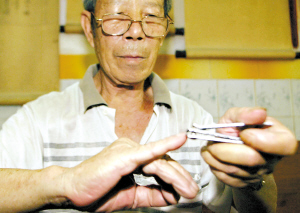 梁伯是个农民,不知道指书亦称“染指书”,北宋已有。由于只看了作品,不知道创作过程,梁伯将右手5个手指试了遍。“试了发现小指最合适,小指写出来的字体可粗可细。”尽管手指确定了,但练成指书却是最近10年的事。“开始练时经常练到手指抽筋。天冷更是被墨冻成冰条,想过放弃。指书对纸的要求也高,试了多次才发现用‘熟宣’最合适。”梁伯说,杏坛文化站站长邓家声经常鼓励他,说顺德只有他一个人会这种古老的艺术,希望他能坚持。