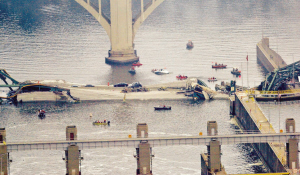 电视画面显示,大桥似乎从中部垮塌,前后均与岸上公路断开。大桥断成几截,落入密西西比河中。