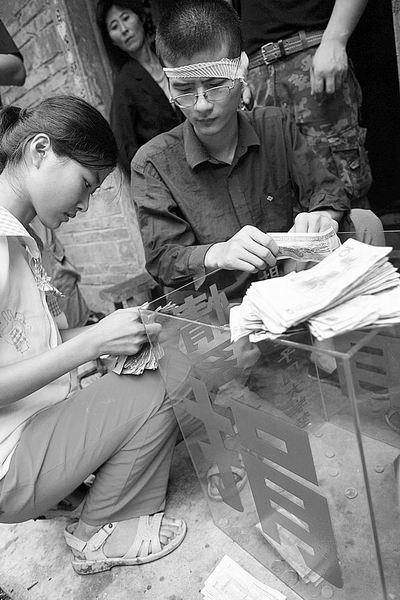昨天下午1时许,记者陪同徐小六等爱心人士踏着泥泞的乡间小路,走进了张金龙和张金凤兄妹俩的家。一番问候后,徐小六打开了一直没有拆封的捐款箱,里面装的是100元、10元、5元和1元的纸币,经清点总共是3312元。接着,徐小六又从身上掏出一沓钱递给了张金凤。顿时,兄妹俩的母亲郑培容哭了,扭过头不断地用衣袖揩着眼泪,他们则看着厚厚的一沓钱,默默地流着泪。