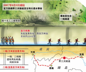 事故发生地距离宜昌124.6公里,透水位置在斜井口以下240米。专家介绍,因地质情况复杂,总长仅220公里的宜万铁路就有隧道114条、桥梁183座,被称为世界“桥隧博物馆”, 是中国施工难度最大的山区铁路。