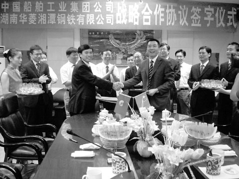 2007年8月2日,中国船舶工业集团公司总经理助理孙伟率队来到华菱湘潭钢铁有限公司,与湘钢总经理刘捷签署双方战略合作协议。协议内容包括:湘钢将优先为中船集团提供优质钢材,并且提供一流服务;中船集团将优先采购湘钢钢材,享受湘钢的最优惠用户待遇;湘钢在船用钢板发配资源上优先考虑中船集团的需求;中船集团在接船前期商务谈判中优先推荐使用湘钢宽厚板,并向中外船东宣传湘钢的产品。