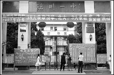 临川一中的大门上挂起条幅,庆祝该校再一次取得好成绩。
