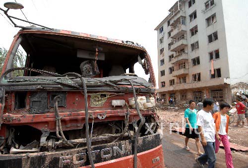 爆炸现场附近的一辆卡车玻璃被震碎(7月5日拍摄)。7月4日20时50分,辽宁省本溪满族自治县田师付镇天赢歌厅发生爆炸,已造成25人死亡,33人受伤。目前,现场清理工作已经完毕。 新华社记者 李钢 摄