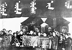 1947年4月23日至5月3日,内蒙古人民代表会议在乌兰浩特召开。会议通过了《内蒙古自治政府施政纲领》《内蒙古自治政府暂行组织大纲》等重要文件,明确规定:自治政府的任务是团结自治区内的蒙、汉、回各族人民,推翻帝国主义扶持下的国民党封建买办大汉族主义的统治,为实现内蒙古地区各族人民的彻底解放而奋斗。会议选出临时参议会,并经参议会选出内蒙古自治政府,乌兰夫任主席。5月1日,内蒙古自治区政府正式宣告成立。26日,中共内蒙古工作委员会成立,乌兰夫任书记。从此,内蒙古自治政府和内蒙古自卫军(1948年1月1日改称内蒙古人民解放军)在内蒙古工委统一领导下,更加有力地开展内蒙古民族自治运动。